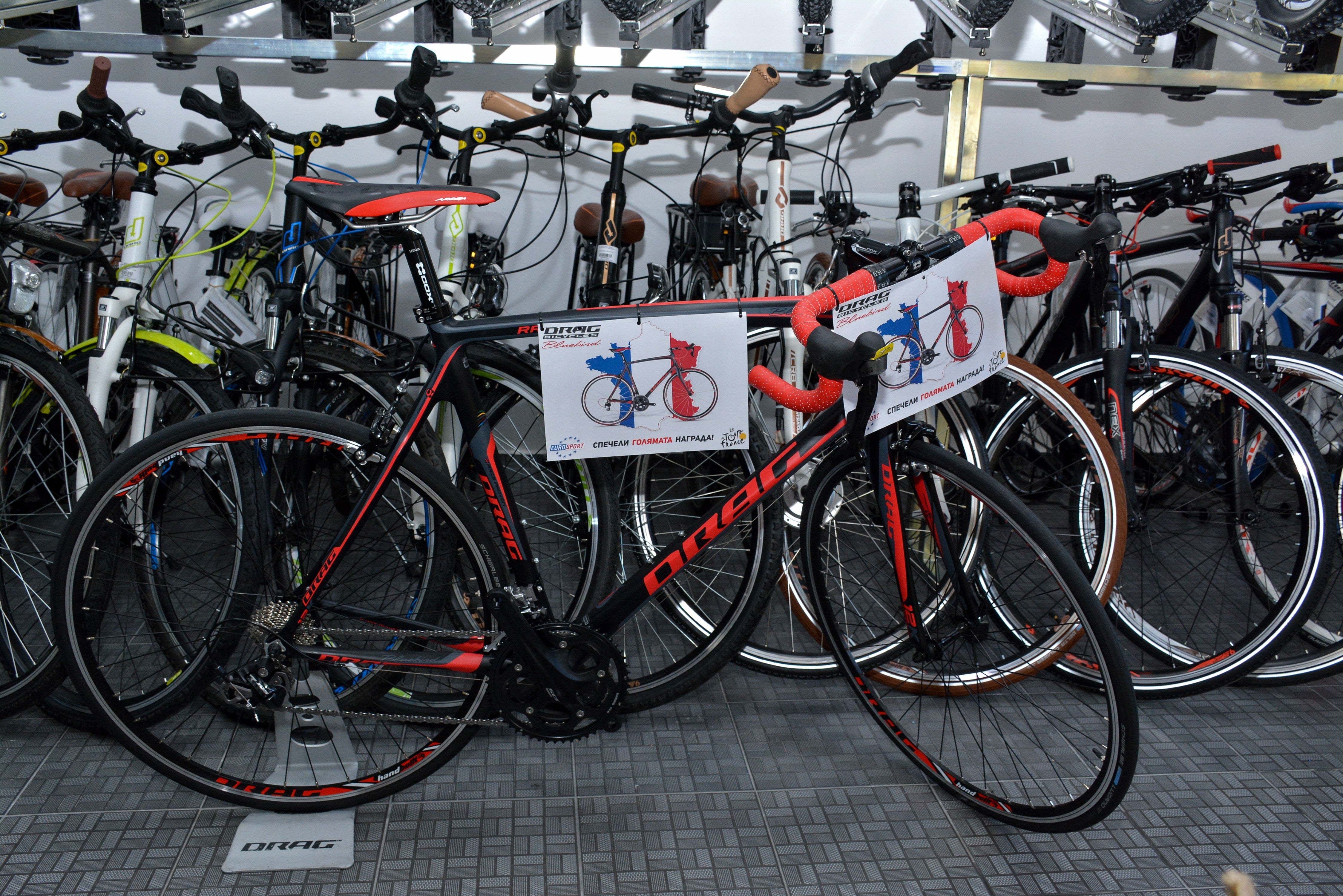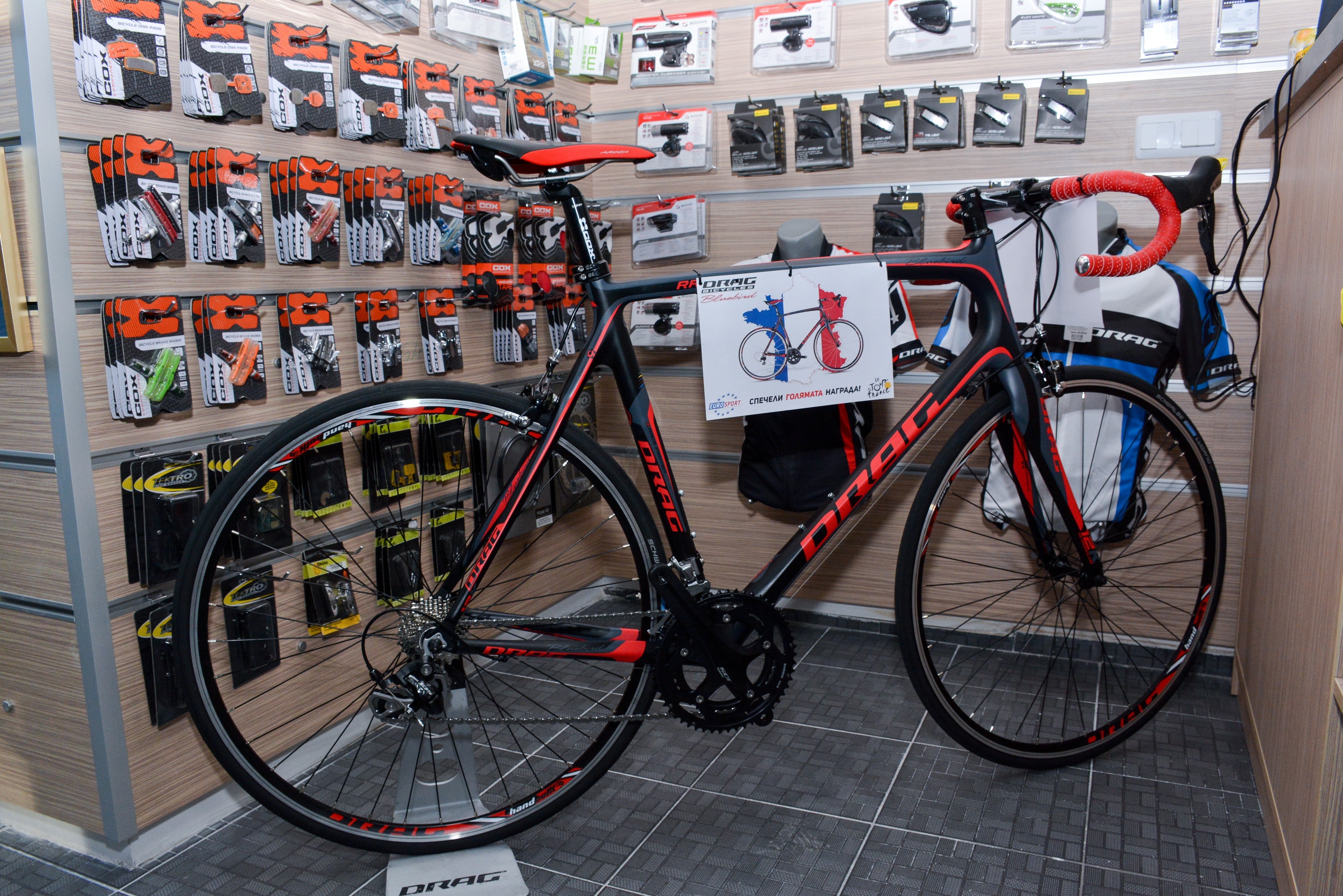 Магазинът предлага пълната гама от велосипеди на марката DRAG – от планински и шосейни до всички размери детски и градски, и огромно разнообразие от велоаксесоари, компоненти и колоездачна екипировка на водещи производители.